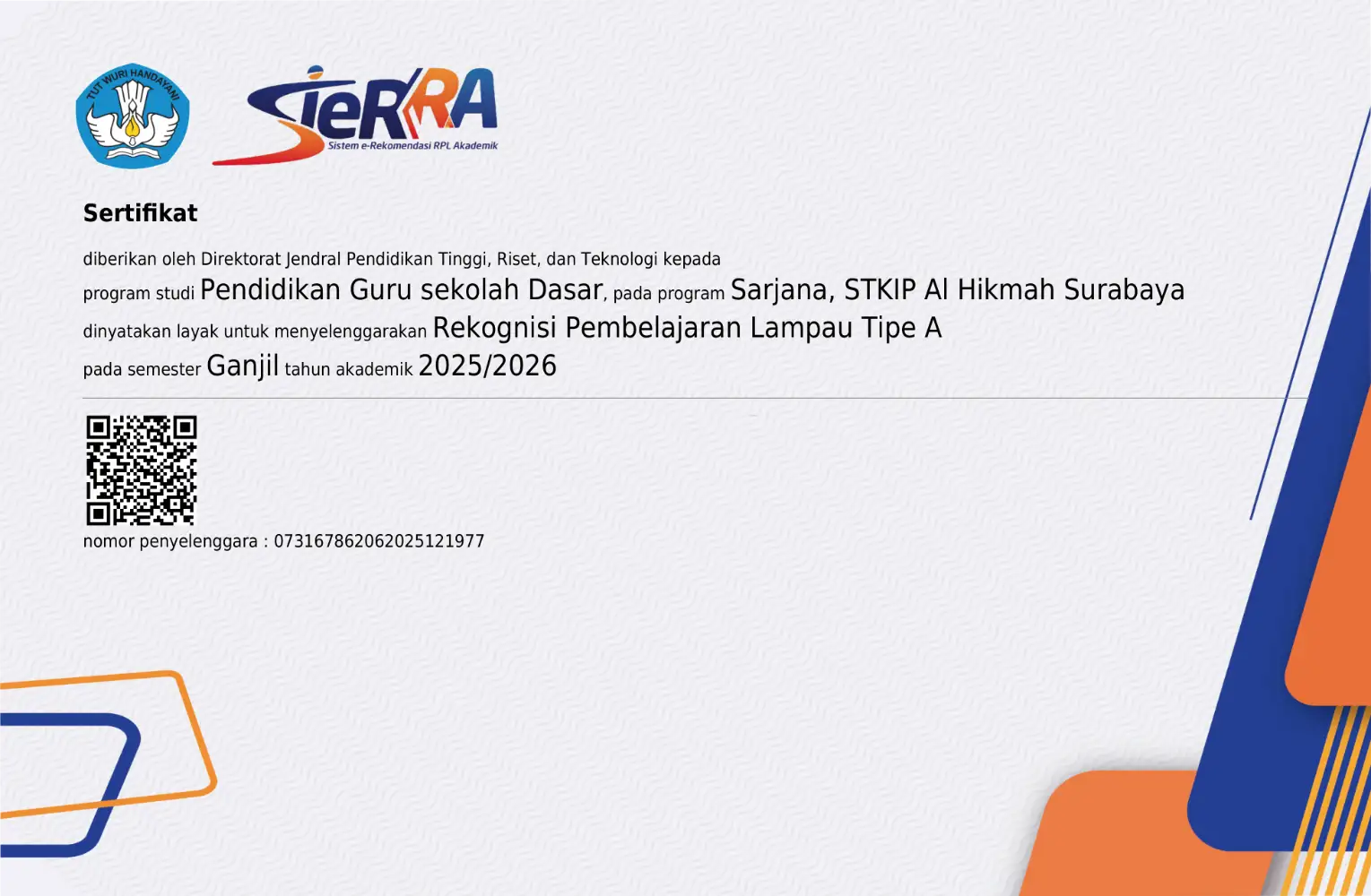 STKIP Al Hikmah Surabaya, maka hasil belajar dari pengalamannya tersebut dapat diajukan untuk disetarakan (direkognisi) dengan hasil belajar formal beberapa Mata Kuliah yang ada di Program Studi di lingkungan STKIP Al Hikmah Surabaya.